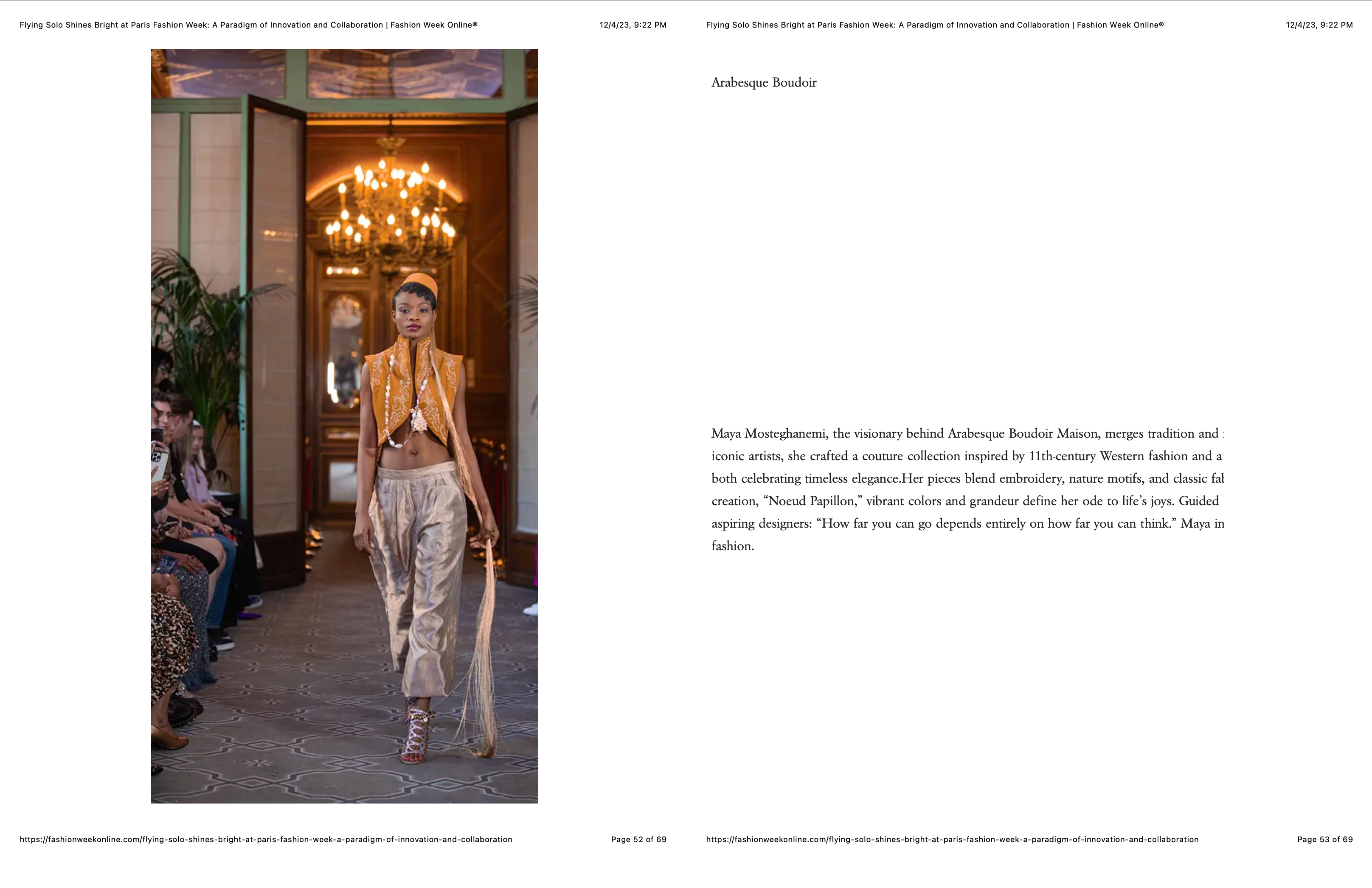 Arabesque Boudoir, the brainchild of visionary artist Maya Mosteghanemi, takes center stage at Paris Fashion Week 2023, enchanting the fashion world with its unparalleled fusion of artistry and style. Embodying a rich history and a bold vision, the brand unveils its latest couture collection, seamlessly blending oil painting and abstract art inspired by Maya's experiences in Paris and New York. With influences from masters like Braque and Minaux, the runway becomes a canvas for Maya's avant-garde creations, transcending conventional boundaries. Her meticulous craftsmanship and exploration of the human subconscious result in garments that are wearable works of art. Arabesque Boudoir emerges as a trailblazer, captivating the global fashion audience at this prestigious event and solidifying its position at the forefront of haute couture innovation.