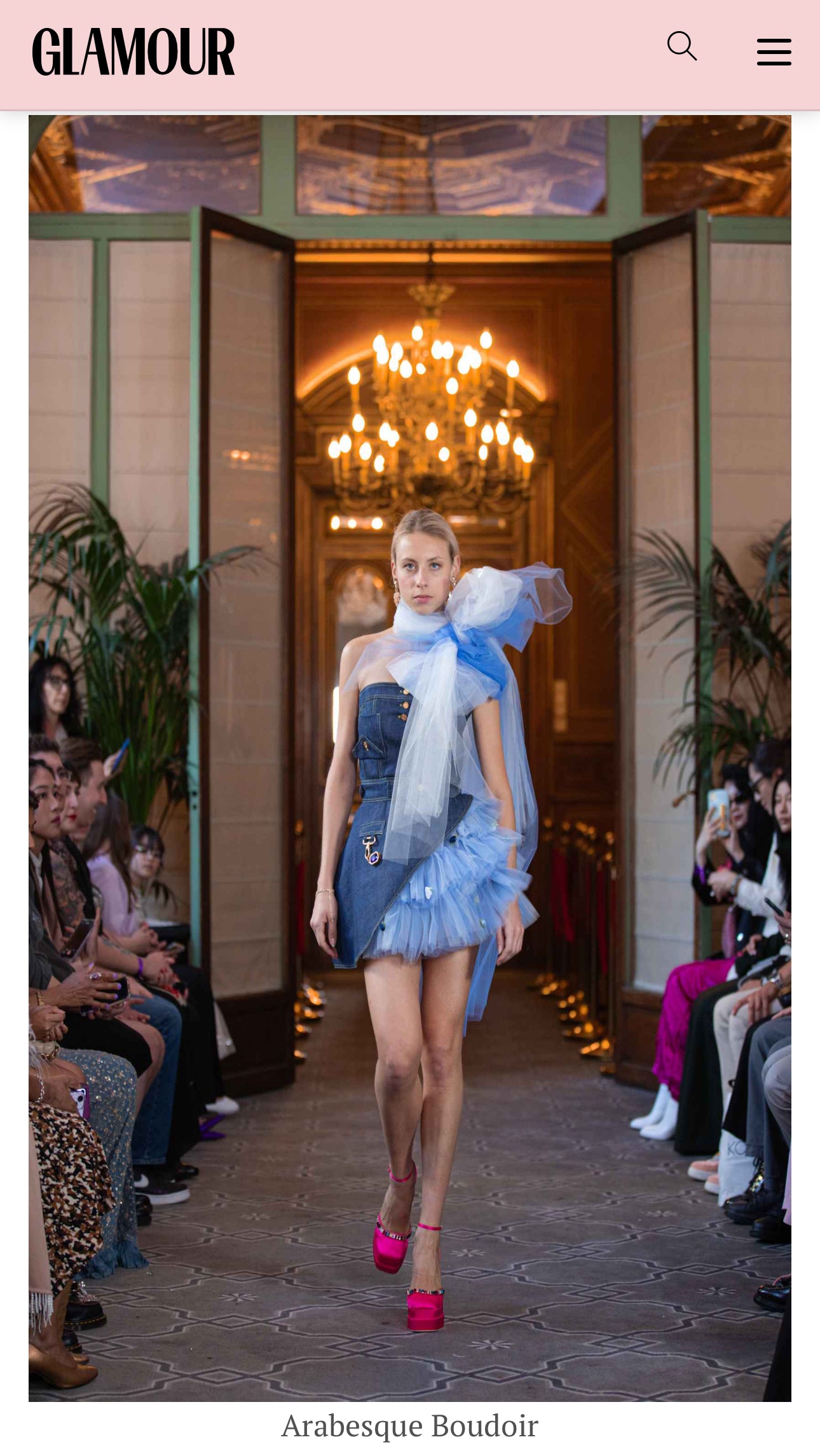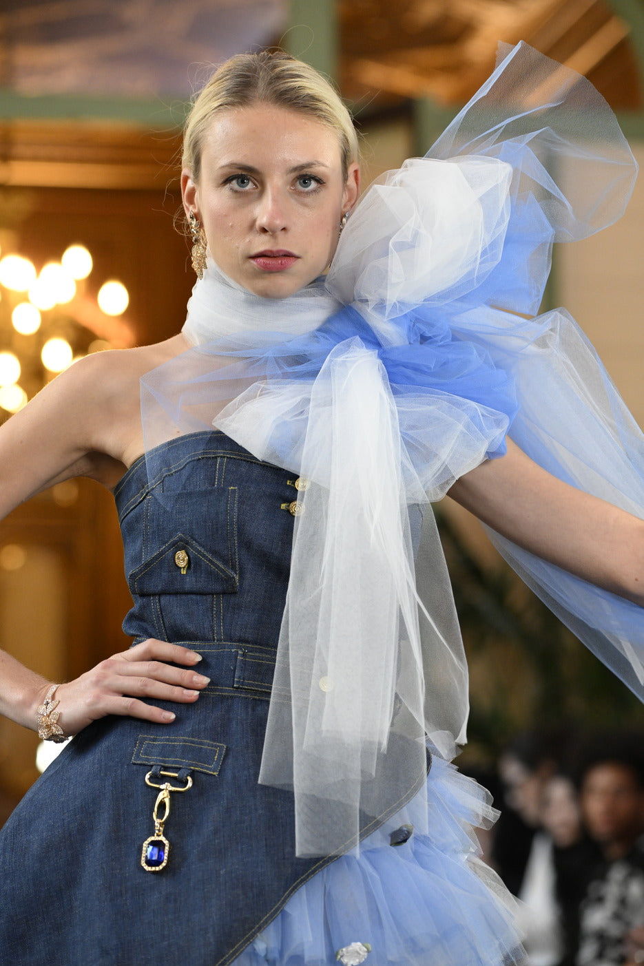 The bold ensemble features a structured denim bodice adorned with a cascading tulle shoulder piece, marrying casual with couture in a stunning display of fashion innovation.