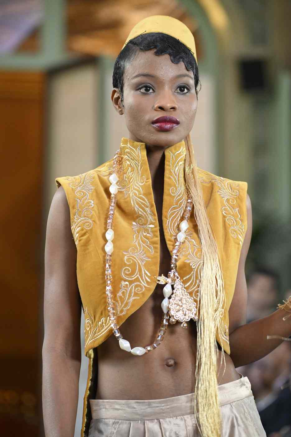 Draped in a golden vest with ornate embroidery and accessorized with statement pearls and fringe, she personifies the innovative spirit that thrives in high fashion.