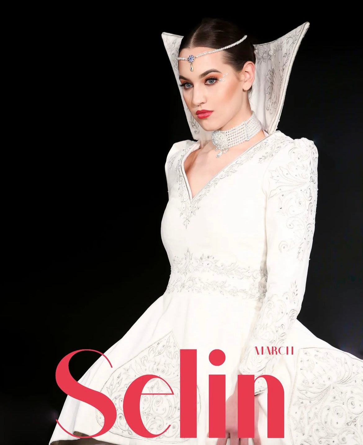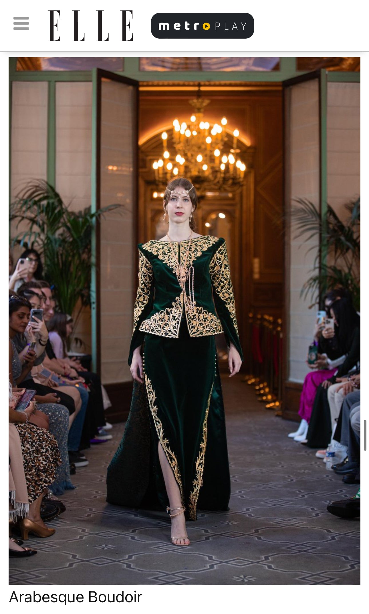 The gown's intricate silver embroidery highlights the artistry of its design, complementing the model's poised elegance and the grandeur of the venue.