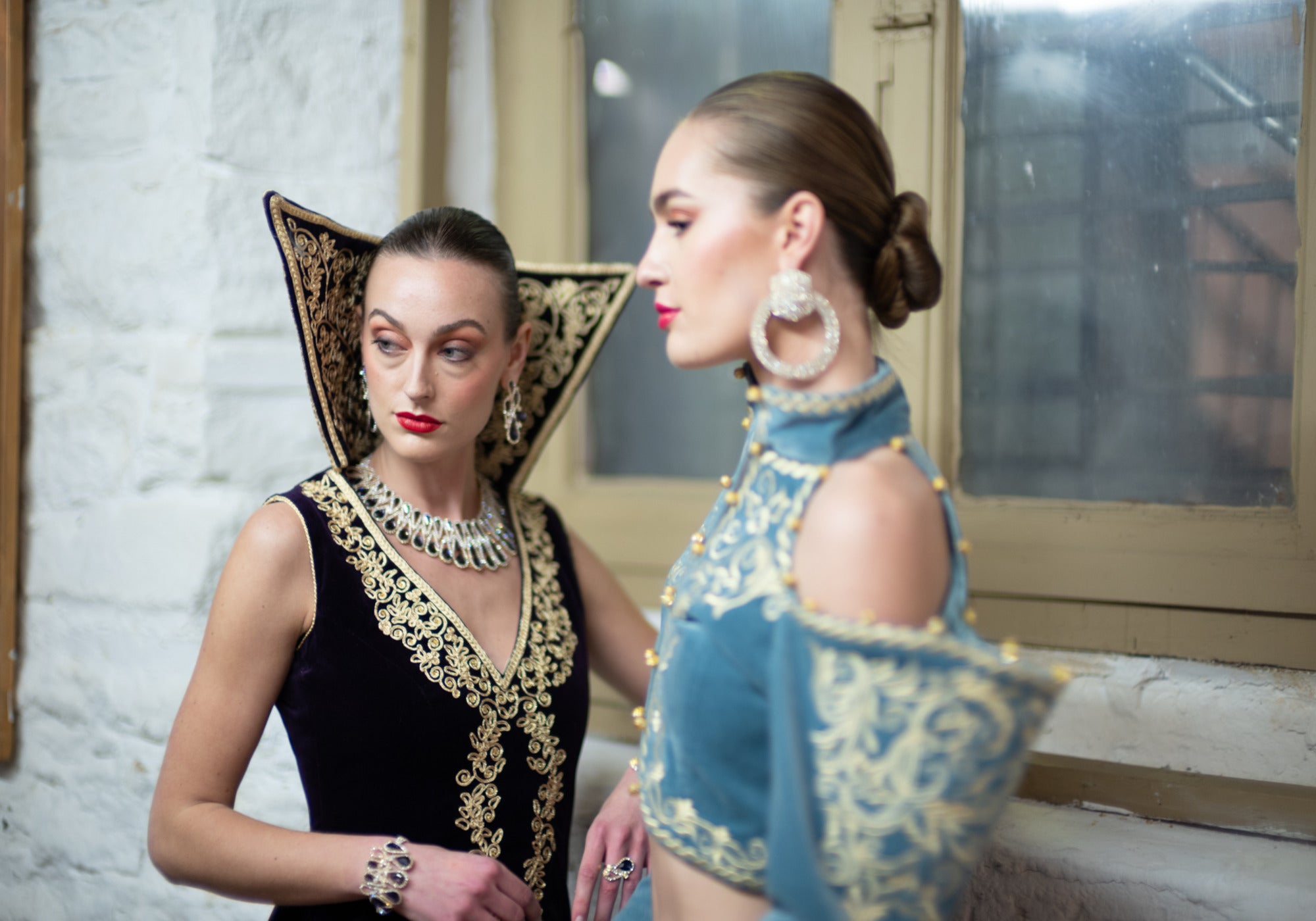 The first collection, "Les Lila," showcases a fascinating myriad of textiles. Combining cultural styles from the Renaissance era and the Ottoman Empire, the collection features a wide range of fabrics, including German velvet lace, gold and silver silk threads, and intricate hand-made embroidery. The intricate details and craftsmanship of the embroidery create a luxurious appearance on the fabrics, serving as a testament to the skill of the artisans who created them. The combination of materials and designs results in a unique and visually stunning collection that is sure to captivate any spectator.